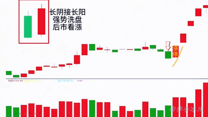 ·第四种:长阴接长阳,强势洗盘,后市看涨。这里先出现长阴,随后收阳线涨停板,通过阴线大跌杀出恐慌盘,再以涨停收回,强势快速洗盘,后市上涨概率大。