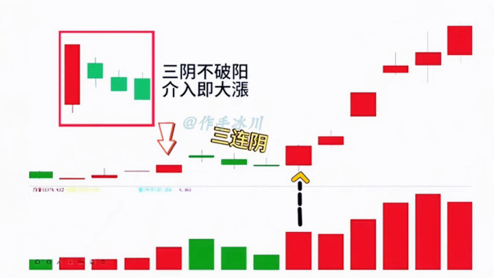 ·第一种:三阴不破阳,介入即大涨。它所指的是当一个票脱离底部开始进入上升通道产生回调,先出现一根阳线,随后走出的三连阴不跌破阳线,最低价就是三阴不破阳。当后续走出一根放量或者被量阳线时就是上车信号。