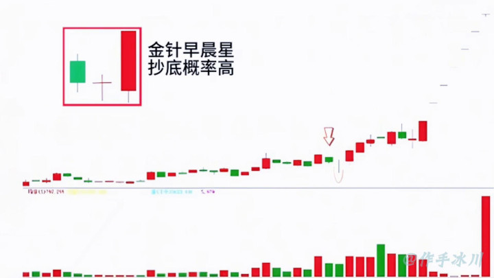 ·第五种:金针早晨星,抄底概率高。什么意思?这里是典型的金针探底,早晨星换而言之股价在下跌的过程中掀起一根阴线,次日收一个跳空低开的十字星,留下长长的下引线,随后在第三日快速收回形成阳线,组成一个强势上涨结构,这个就叫早晨星。在实操中底部区间出现胜率高。